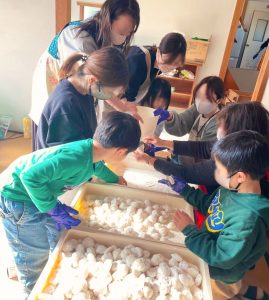 そして、会館の中では出来上がったばかりのおもちをみんなで食べやすいサイズに丸める作業を行い、とても和やかな空間となっていました。