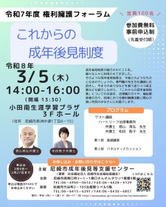 令和8年3月5日(木)に令和7年度権利擁護フォーラムを開催します。今年は「これからの成年後見制度」というテーマで、弁護士による基調講演と成年後見人として活動している専門職を交えてパネルディスカッションを実施します。