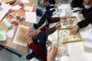 下地を作ってきてくれる方、雑巾縫いチーム用に針山を手作りして持ってきてくれる方、別のテーブルの方に作業を